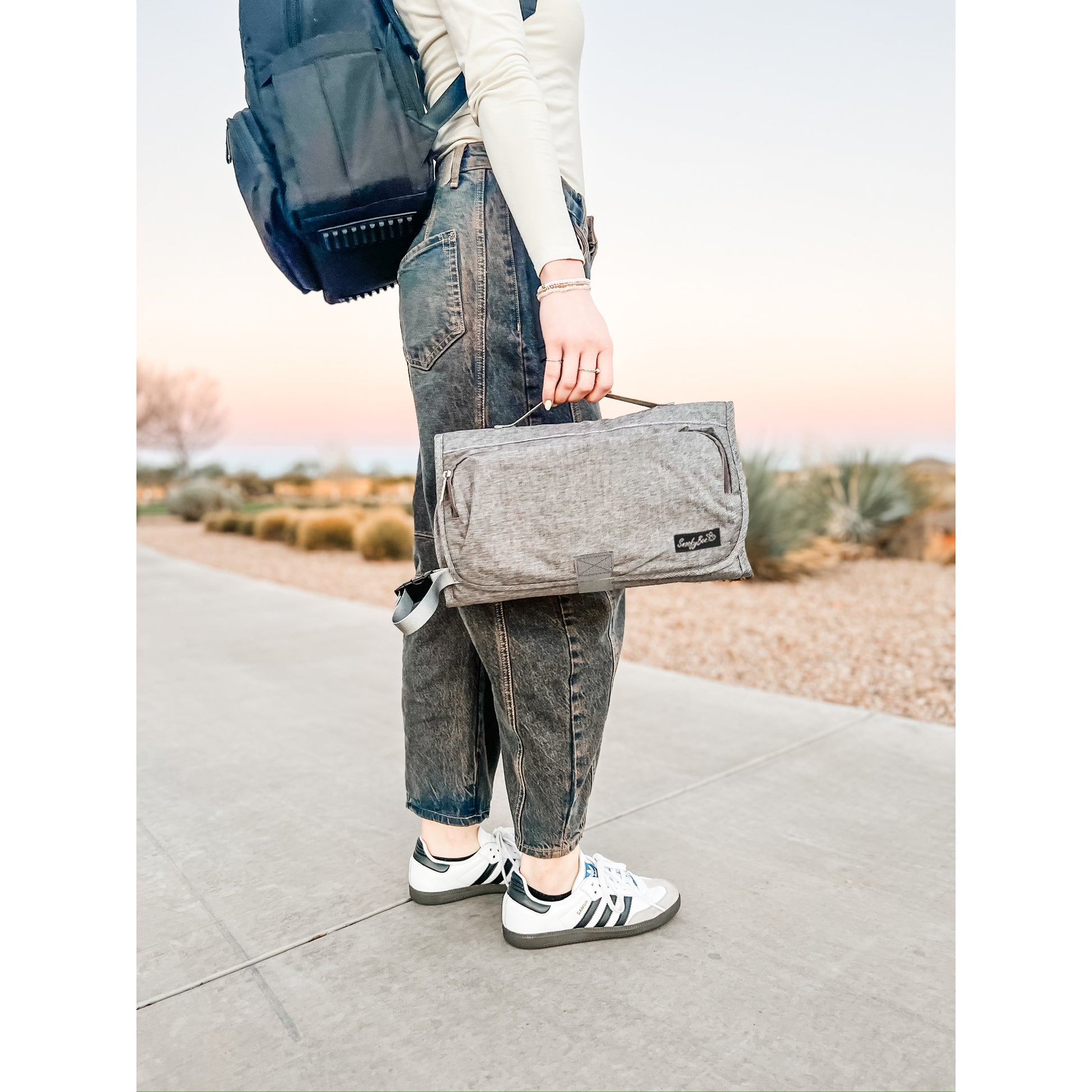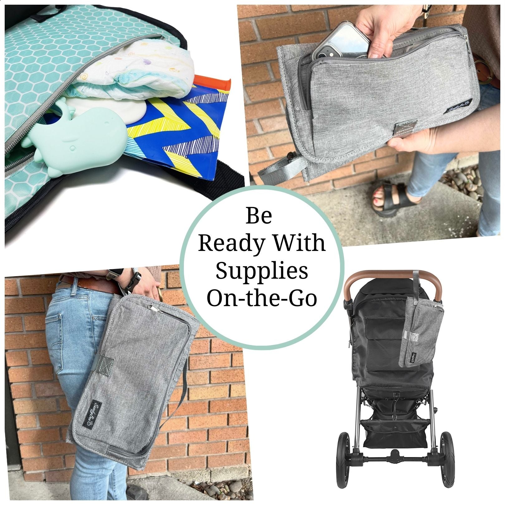 The Playtime Changing Pad can also be used as a small clutch diaper bag and changing station, and has a strap that can be attached to your wrist or stroller along with a handle on the top to grab quickly.