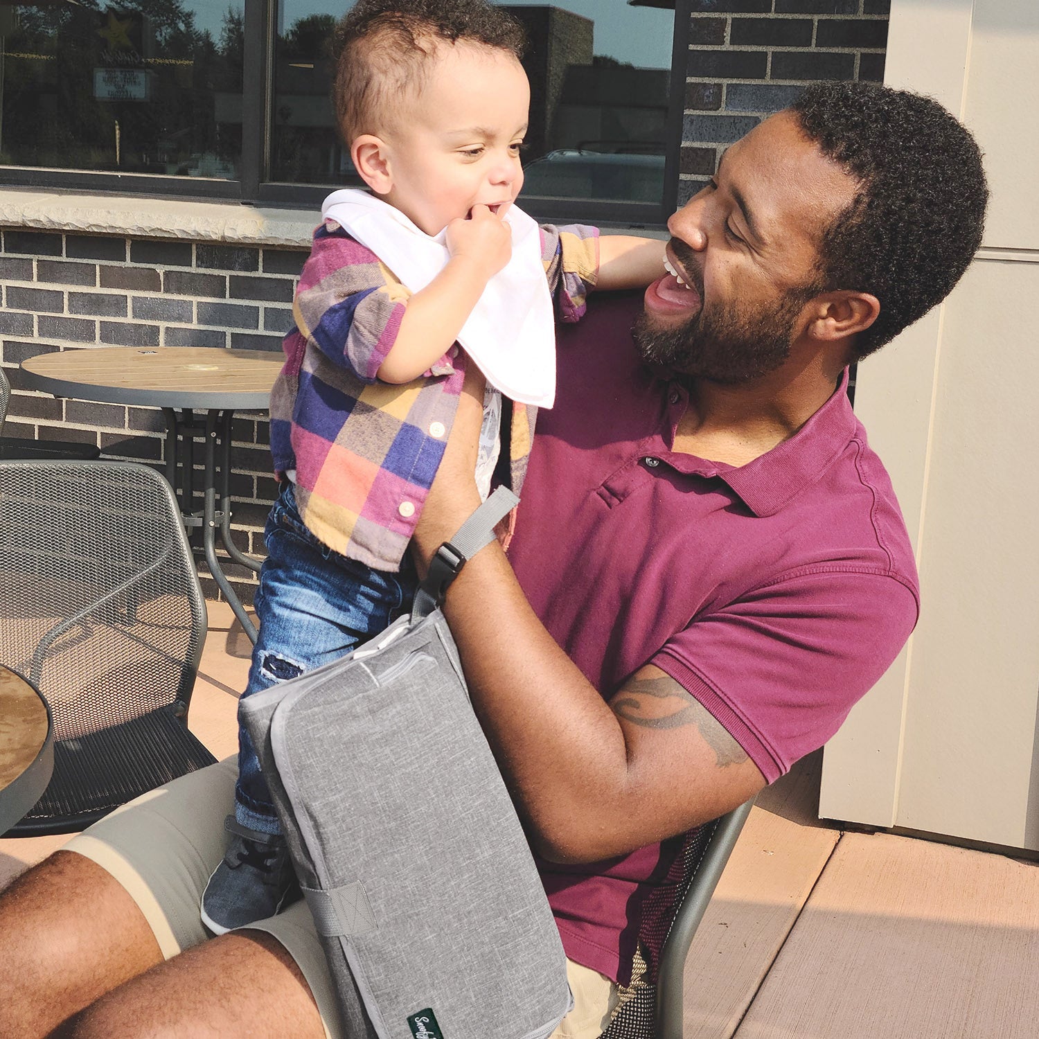 With its built-in pillow and padding throughout, compact portable size, water-resistant surface, and strap to hang from your wrist or stroller, the Playtime Changing Pad™ has everything you need to make diaper changing a breeze—at home or on the go!