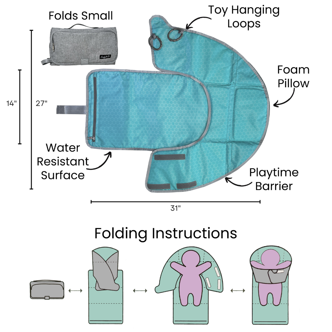 Introducing the Playtime Changing Pad Excursion Edition, the ultimate solution for on-the-go diapering with entertainment. This portable changing pad has a unique toy-hanging barrier that sets it apart from others on the market. It keeps your child's hands out of the mess during diaper changes, and provides entertainment for them when you attach their favorite toys. This clean hands changing pad design makes diaper changes a breeze.